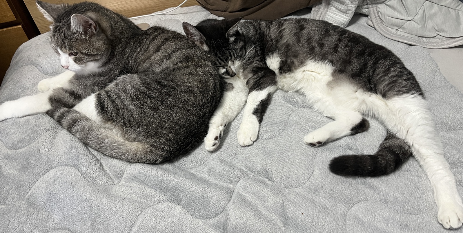 猫日記:くっついてお昼寝 2025.08.30 今日はつむじとこはだが、くっついてお昼寝していました。つむじは起きて外を見てるのに、こはだは完全に安心して爆睡中。 ちょっと部屋は散らかってるけど(笑)、猫たちが幸せそうに寝てるならそれでいいかなと思えます🐾