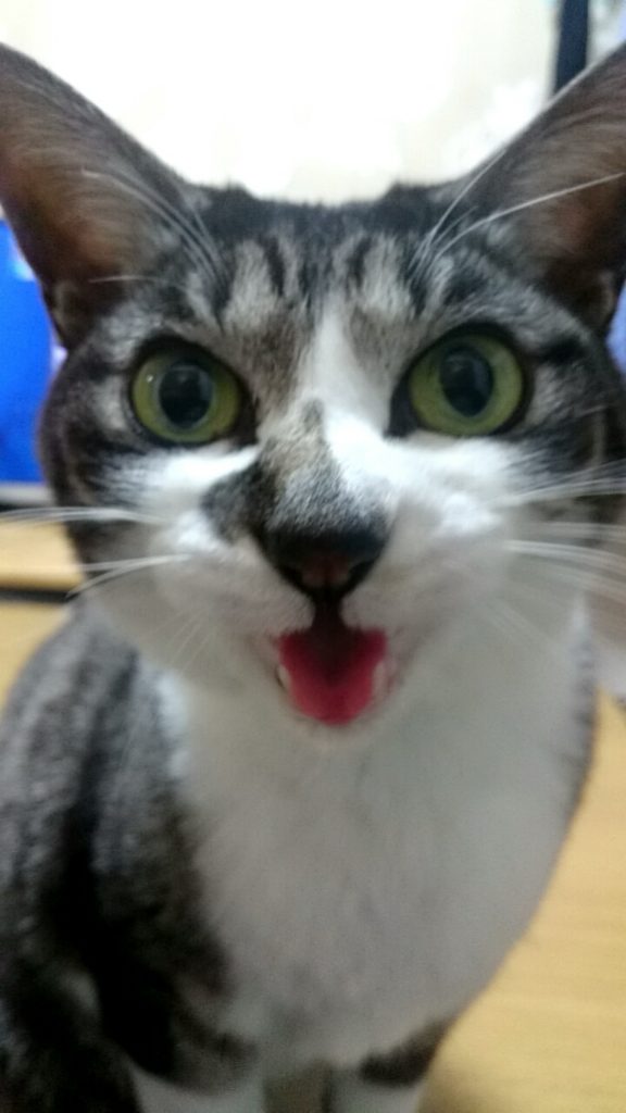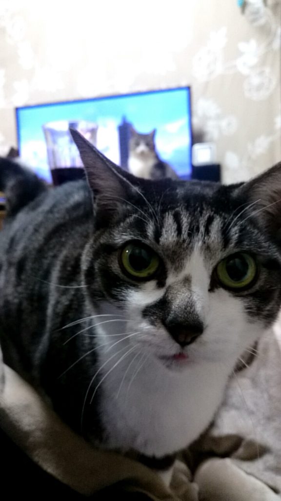 テレビどころか、カメラにまで接近してアピールするつむじ。大きなグリーンの瞳とほんのり出た舌先に、思わずこちらが固まります。背景にはぼんやりテレビが映っていますが、もはや画面はどうでもよくなる瞬間です。