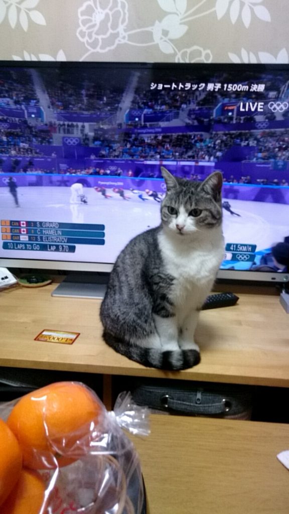 冬季五輪のショートトラック決勝(2018年の写真だから平昌オリンピックなのかな)を見ていたときのこと。滑走している選手たちにかぶせるように、こはだがテレビ台に鎮座。手前にはみかんの袋も鎮座していて、もはや何の競技か分からない状態です。お尻にオリンピックの輪マークが付いているんじゃないかと錯覚しそう。