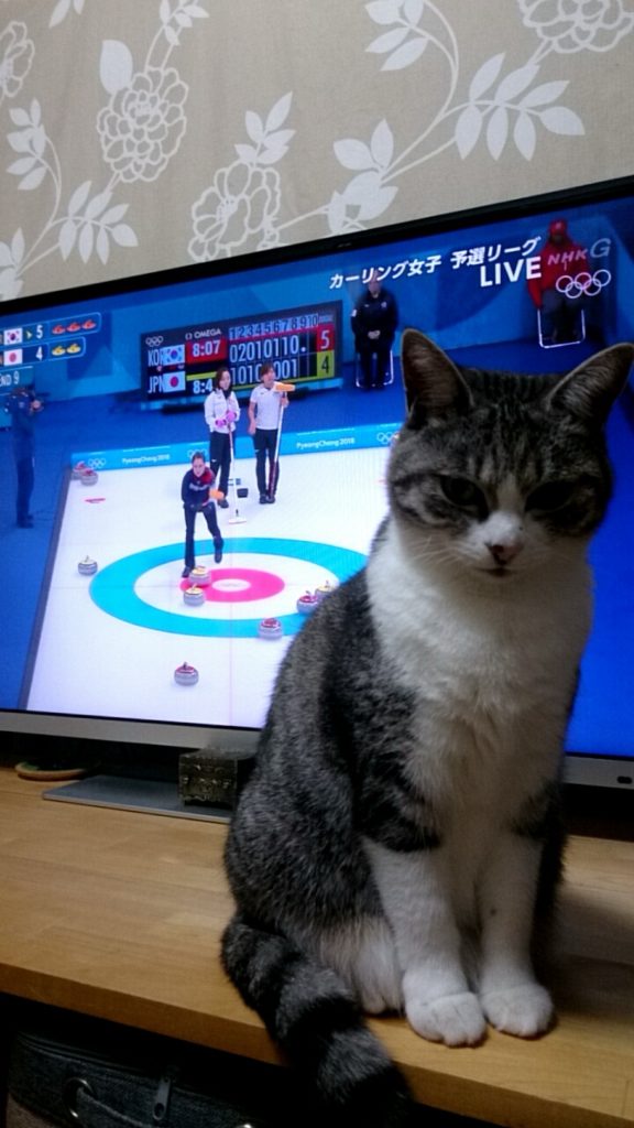 最後は再びオリンピック。カーリングの予選リーグを応援していたら、こはだが無表情で鎮座。リンクに転がるストーンの行方は全く見えません。そのうち猫たち自身がストーンに乗って滑り出すんじゃないかと心配になるほどです。