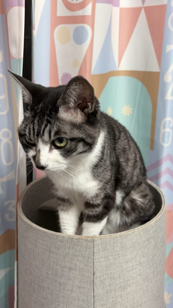 リビングのキャットタワーを見上げると、そこにはまるで王座に座るかのような姿が…。